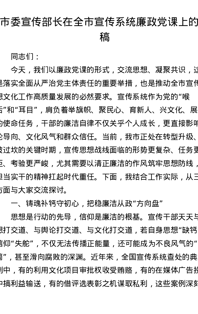 市委宣传部长在全市宣传系统廉政党课上的讲稿