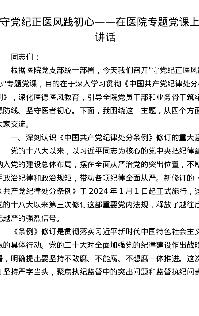 守党纪正医风践初心——在医院专题党课上的讲话
