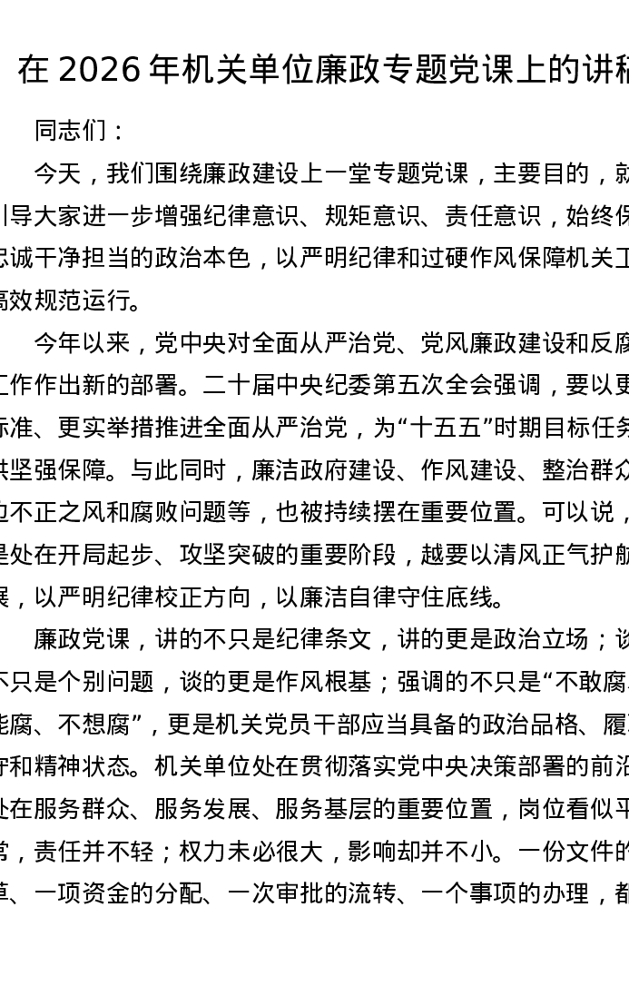 在2026年机关单位廉政专题党课上的讲稿