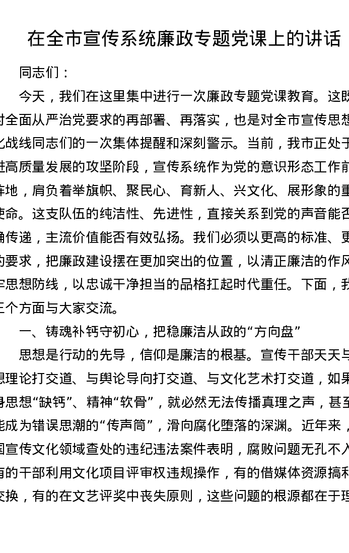 在全市宣传系统廉政专题党课上的讲话