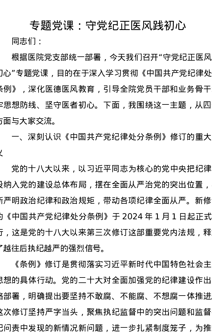 专题党课:守党纪 正医风 践初心