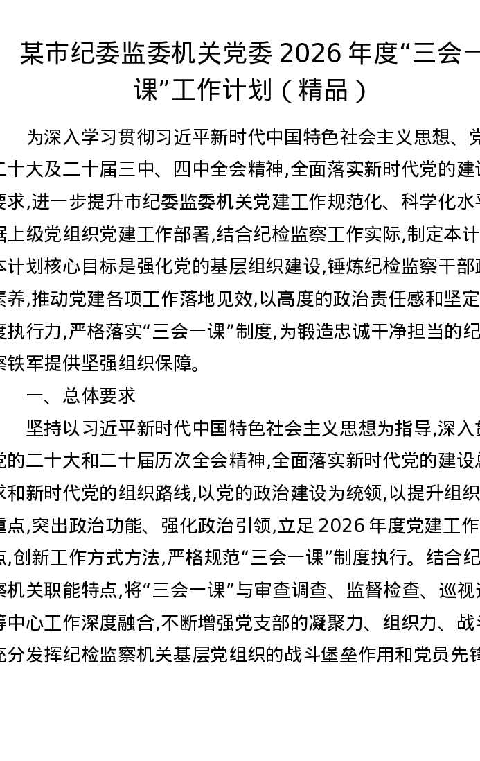 某市纪委监委机关党委2026年度三会一课工作计划