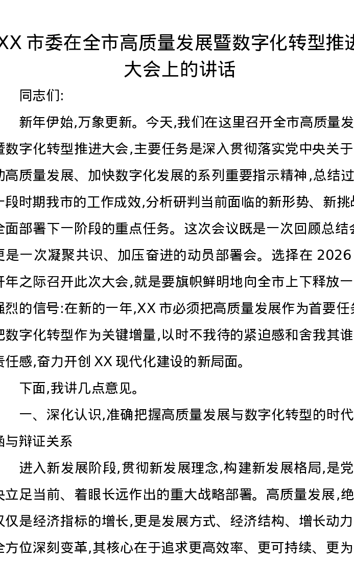 XX市委在全市高质量发展暨数字化转型推进大会上的讲话