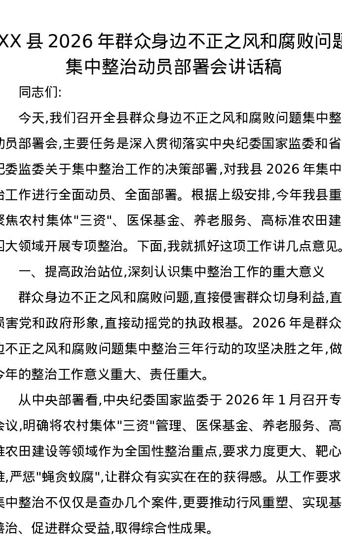 XX县2026年群众身边不正之风和腐败问题集中整治动员部署会讲话稿