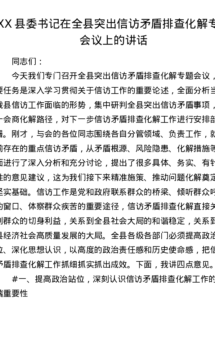 XX县委书记在全县突出信访矛盾排查化解专题会议上的讲话(8224字)