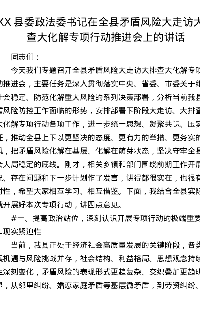 XX县委政法委书记在全县矛盾风险大走访大排查大化解专项行动推进会上的讲话(9302字)