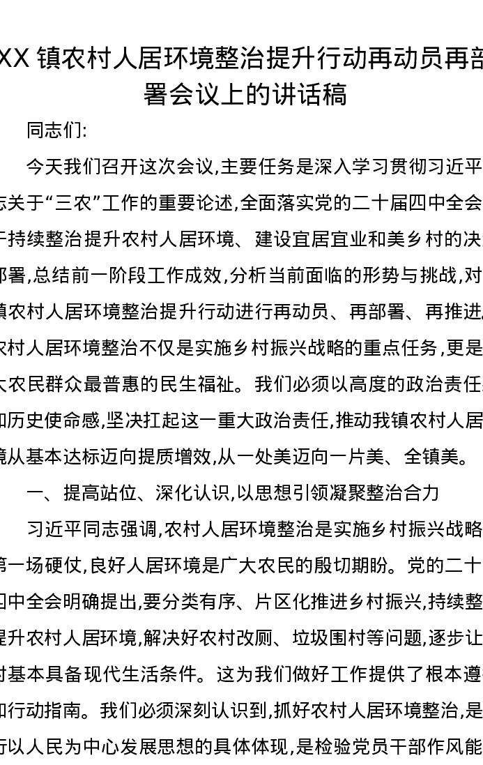 XX镇农村人居环境整治提升行动再动员再部署会议上的讲话稿