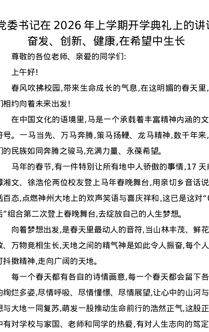 党委书记在2026年上学期开学典礼上的讲话奋发、创新、健康,在希望中生长