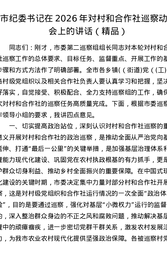 市纪委书记在2026年对村和合作社巡察动员会上的讲话
