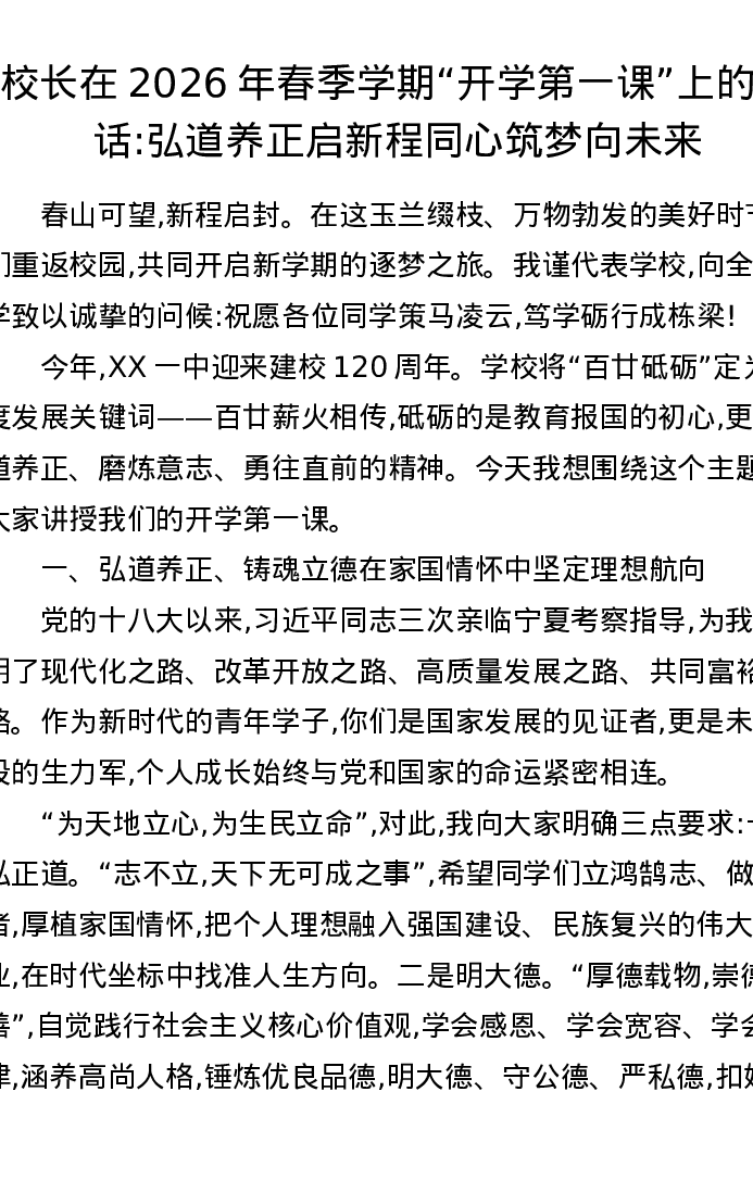 校长在2026年春季学期开学第一课上的讲话:弘道养正启新程同心筑梦向未来
