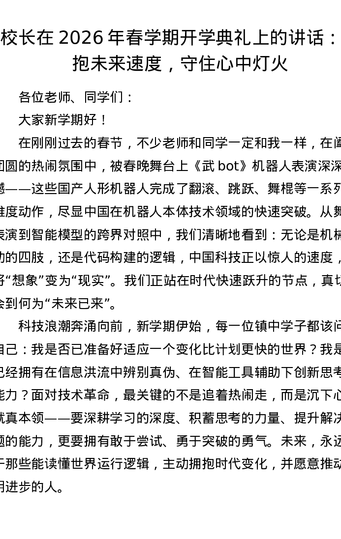 校长在2026年春学期开学典礼上的讲话:拥抱未来速度,守住心中灯火