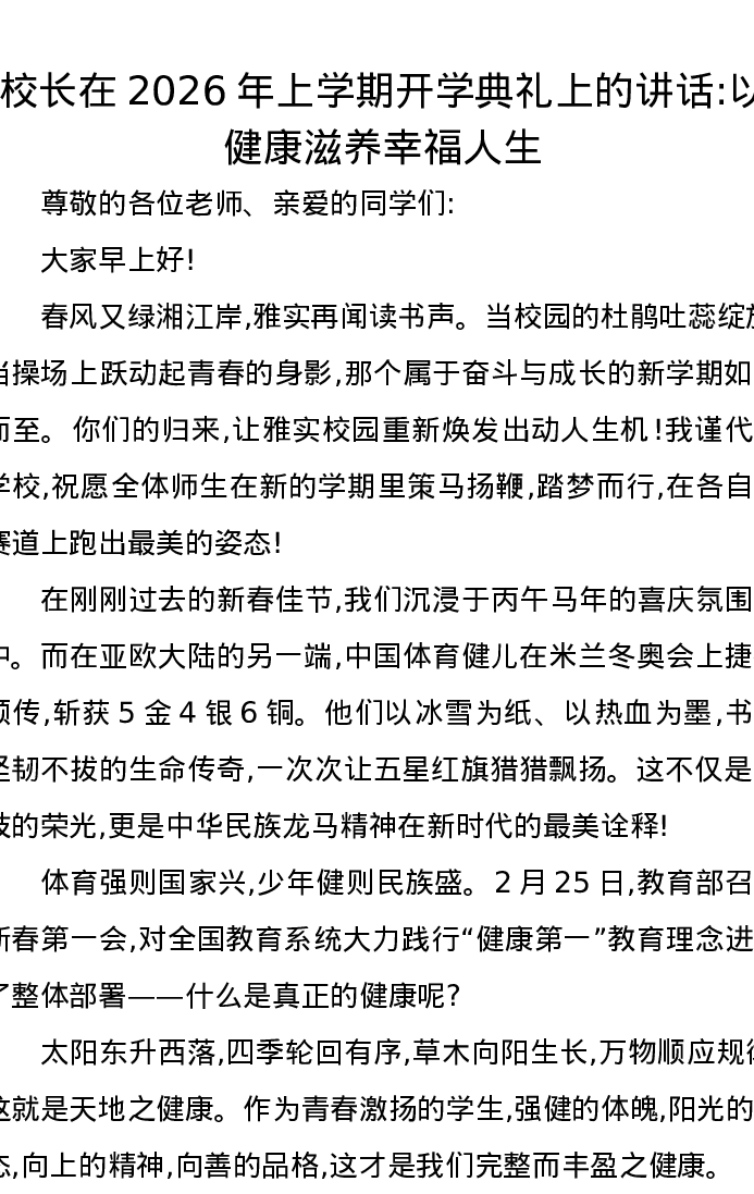 校长在2026年上学期开学典礼上的讲话以健康滋养幸福人生