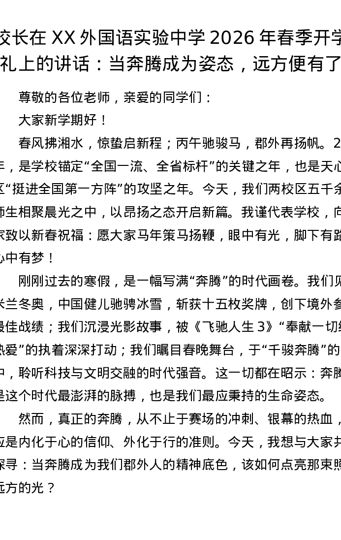 校长在XX外国语实验中学2026年春季开学典礼上的讲话:当奔腾成为姿态,远方便有了光