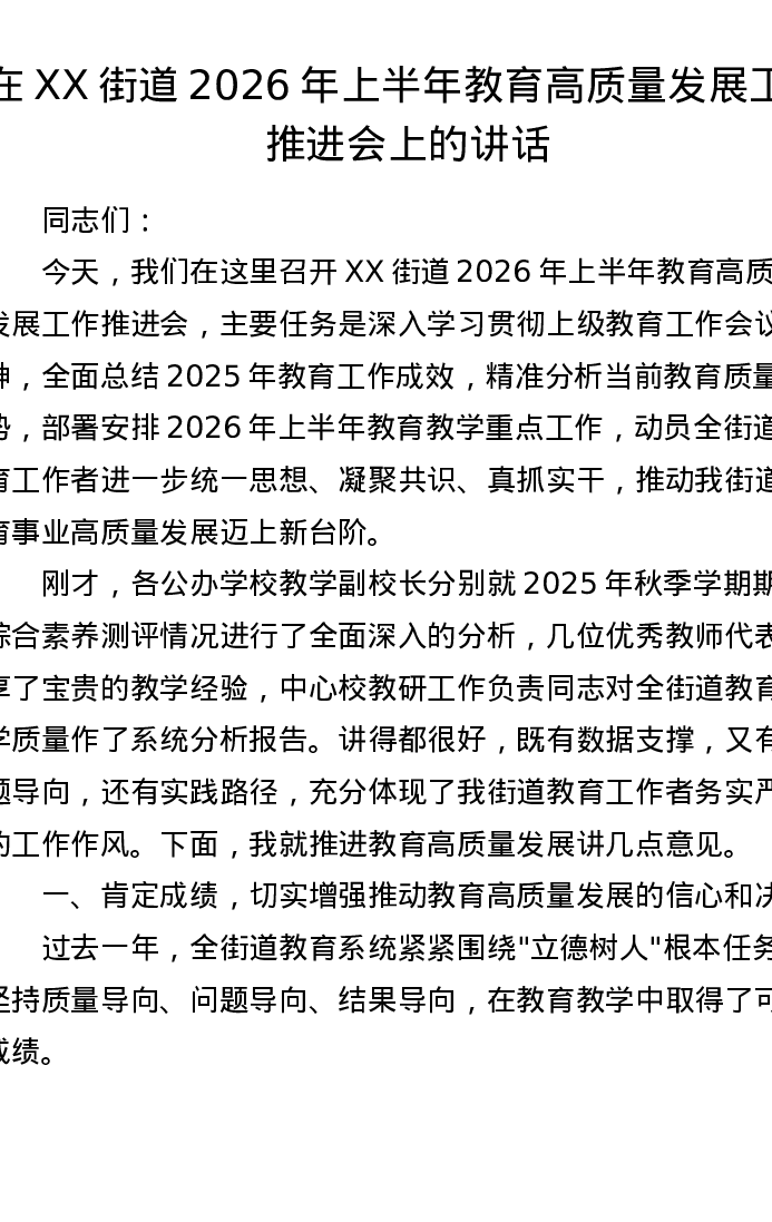 在XX街道2026年上半年教育高质量发展工作推进会上的讲话