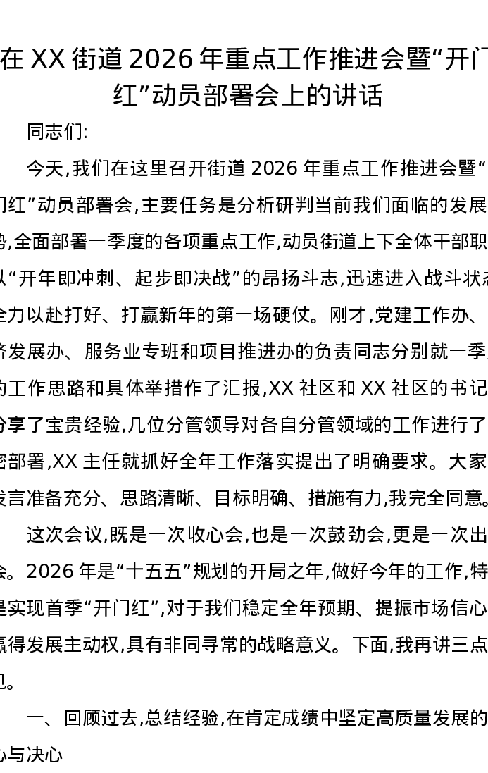 在XX街道2026年重点工作推进会暨开门红动员部署会上的讲话