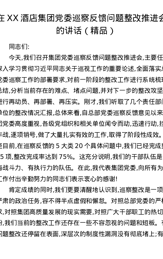 在XX酒店集团党委巡察反馈问题整改推进会上的讲话