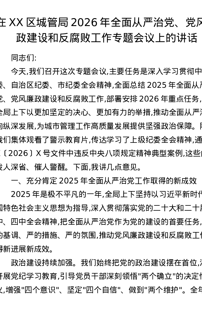 在XX区城管局2026年全面从严治党、党风廉政建设和反腐败工作专题会议上的讲话
