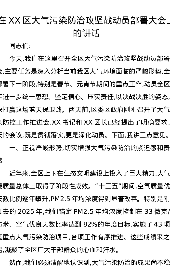 在XX区大气污染防治攻坚战动员部署大会上的讲话