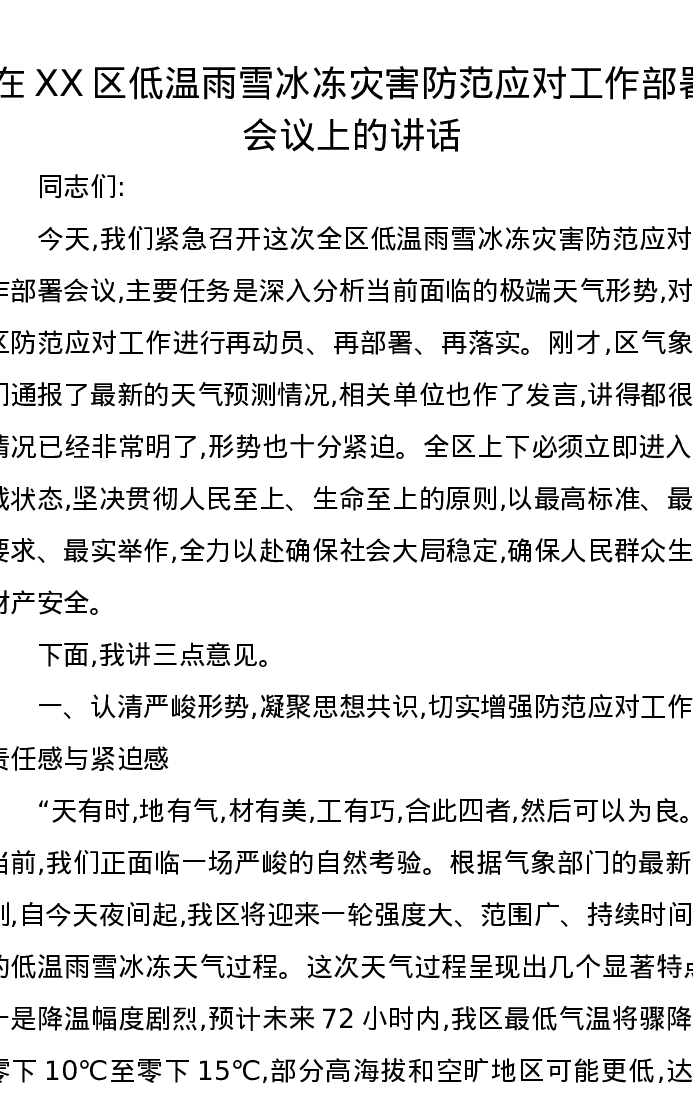 在XX区低温雨雪冰冻灾害防范应对工作部署会议上的讲话