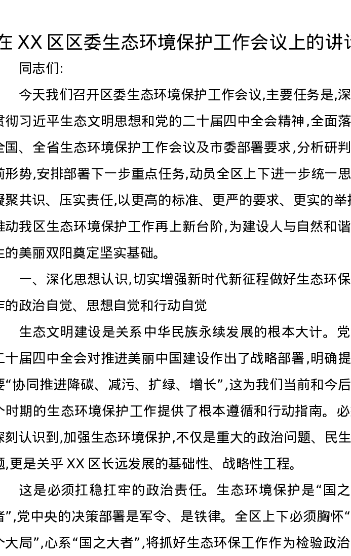 在XX区区委生态环境保护工作会议上的讲话