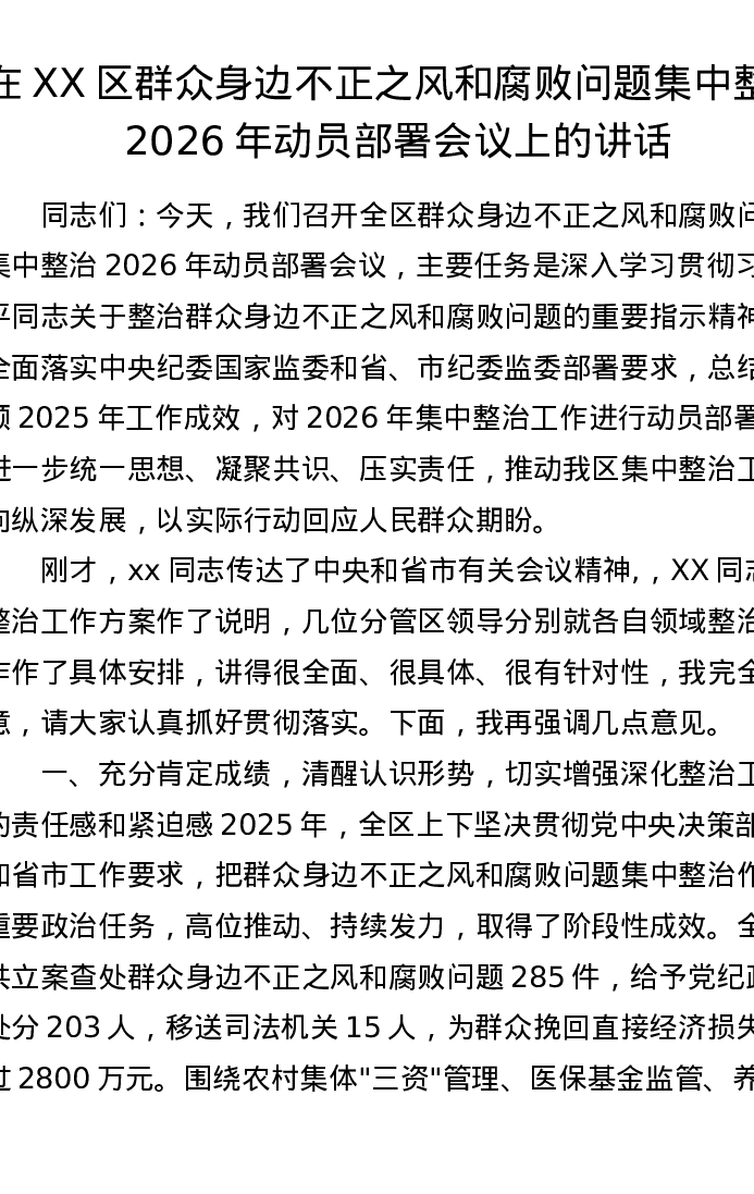 在XX区群众身边不正之风和腐败问题集中整治2026年动员部署会议上的讲话