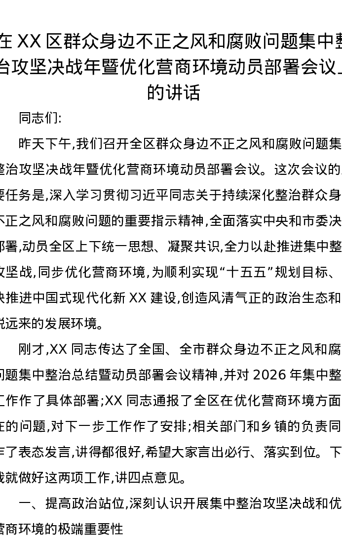 在XX区群众身边不正之风和腐败问题集中整治攻坚决战年暨优化营商环境动员部署会议上的讲话