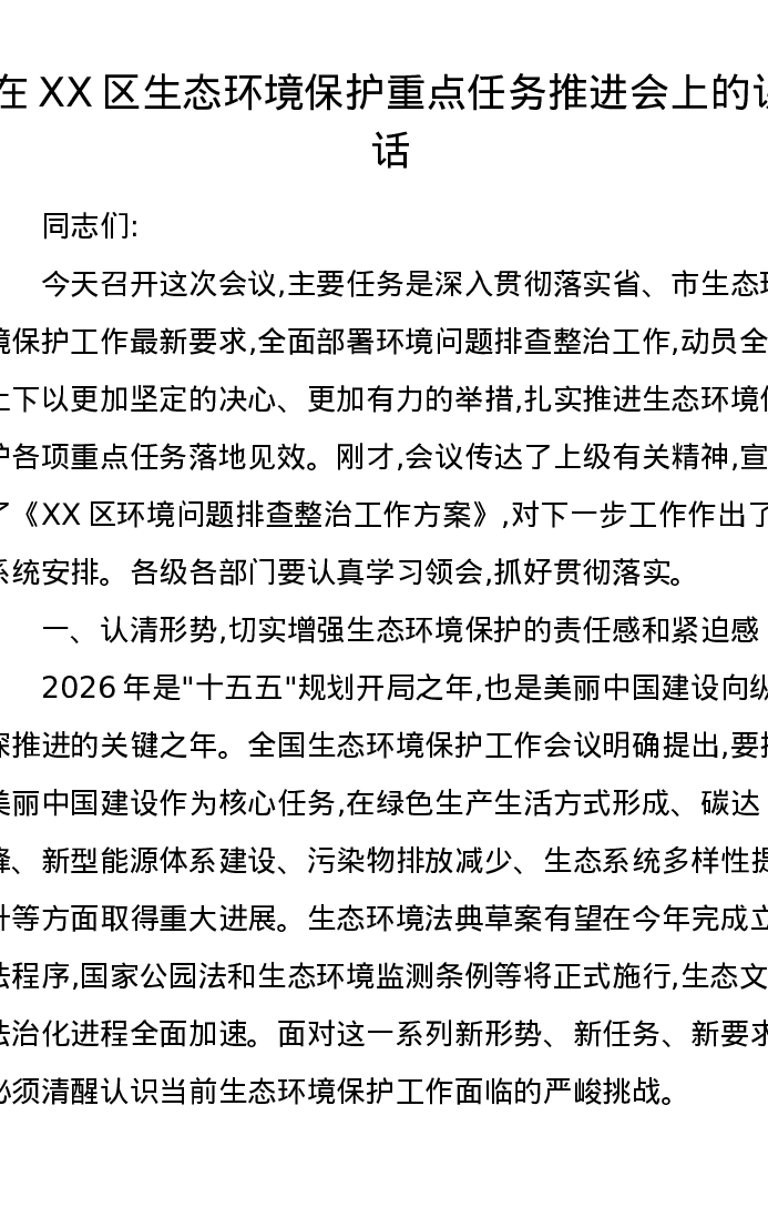 在XX区生态环境保护重点任务推进会上的讲话