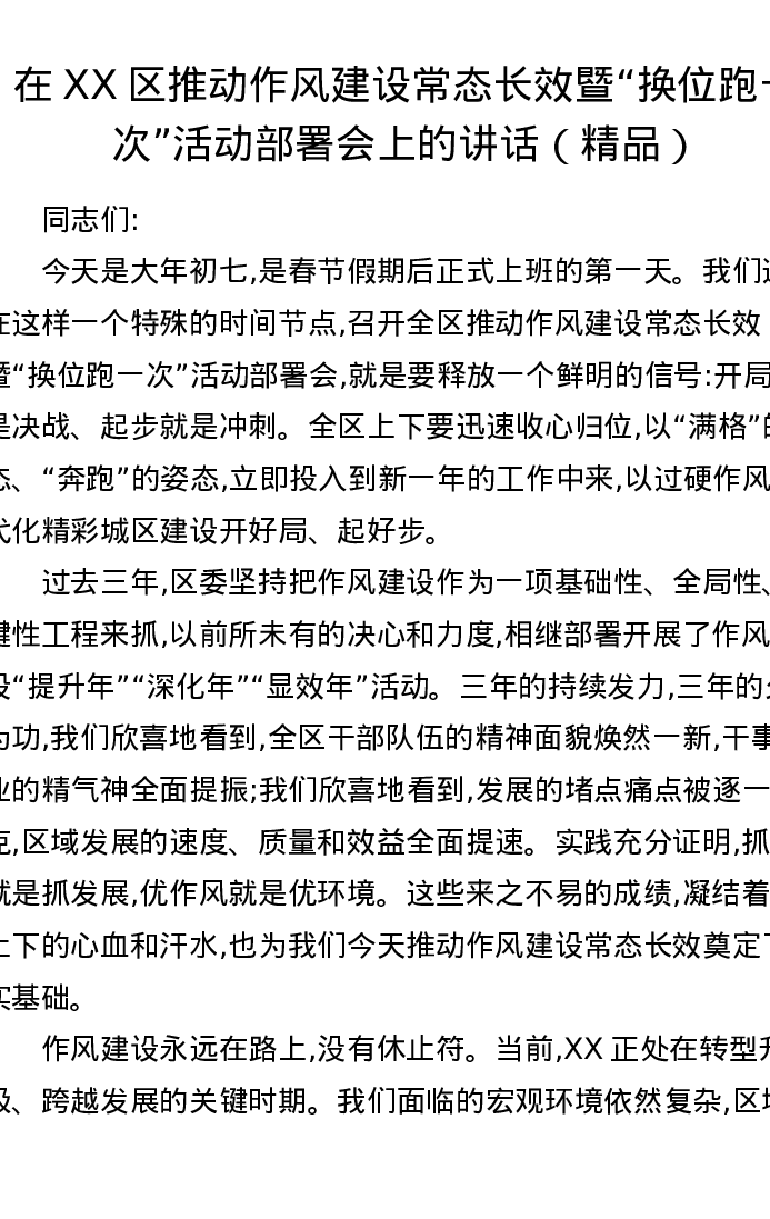 在XX区推动作风建设常态长效暨换位跑一次活动部署会上的讲话
