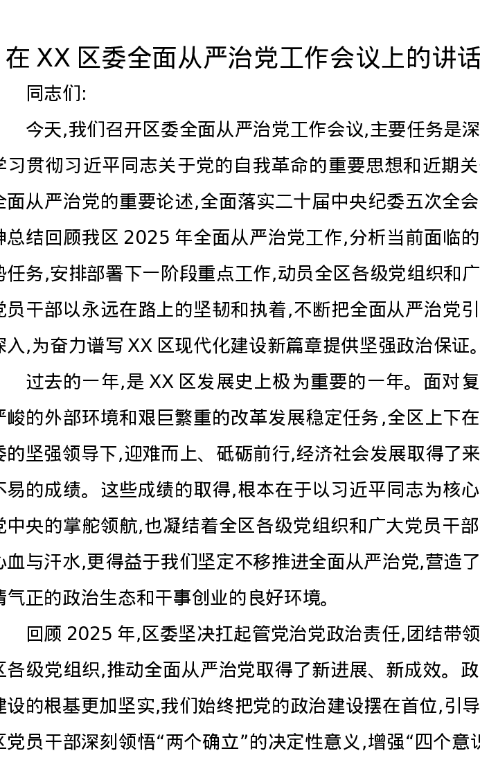 在XX区委全面从严治党工作会议上的讲话