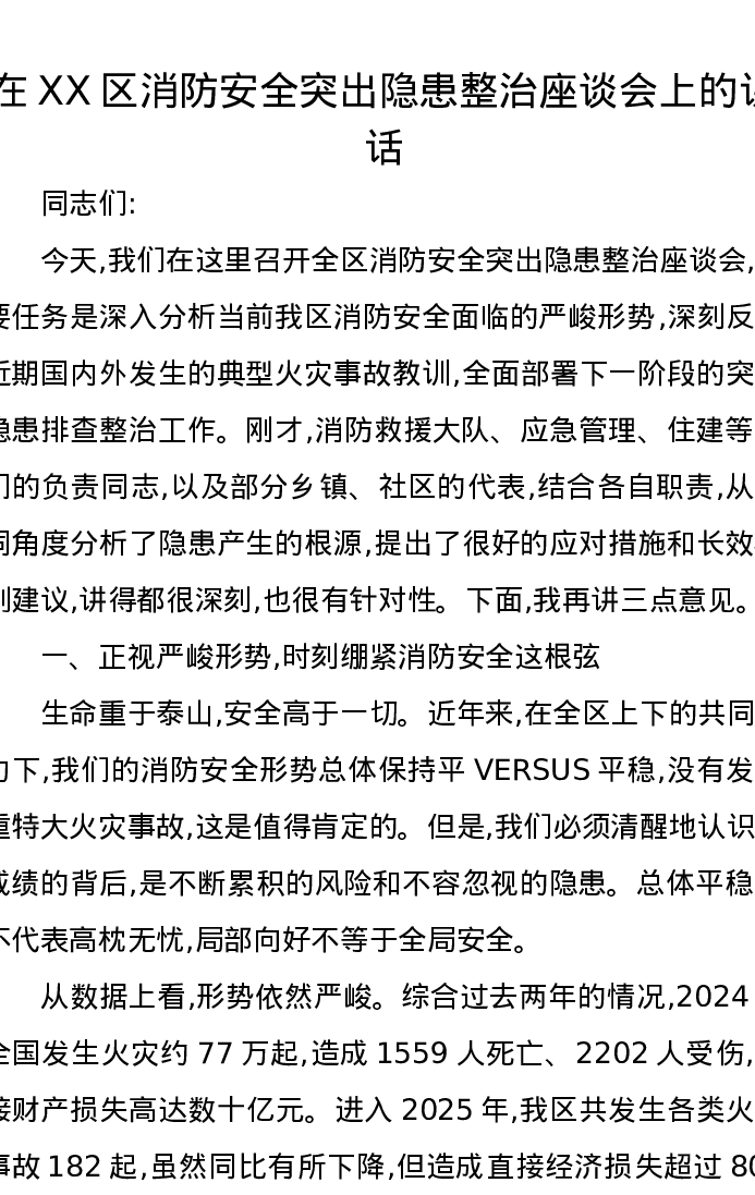 在XX区消防安全突出隐患整治座谈会上的讲话