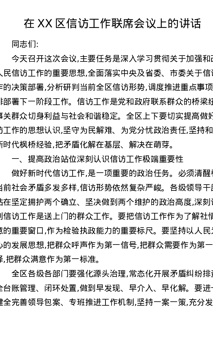 在XX区信访工作联席会议上的讲话