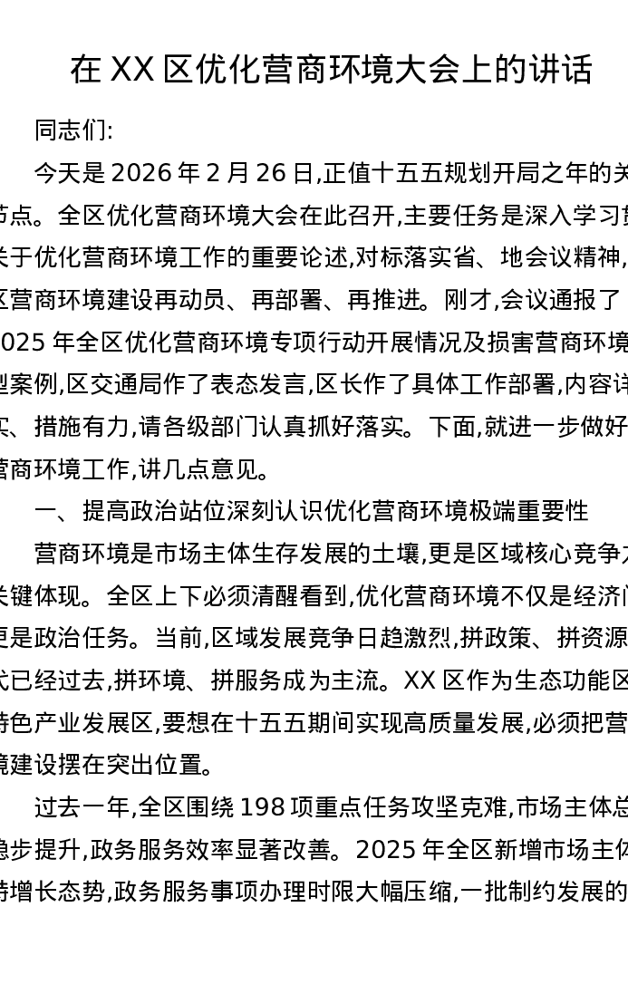 在XX区优化营商环境大会上的讲话