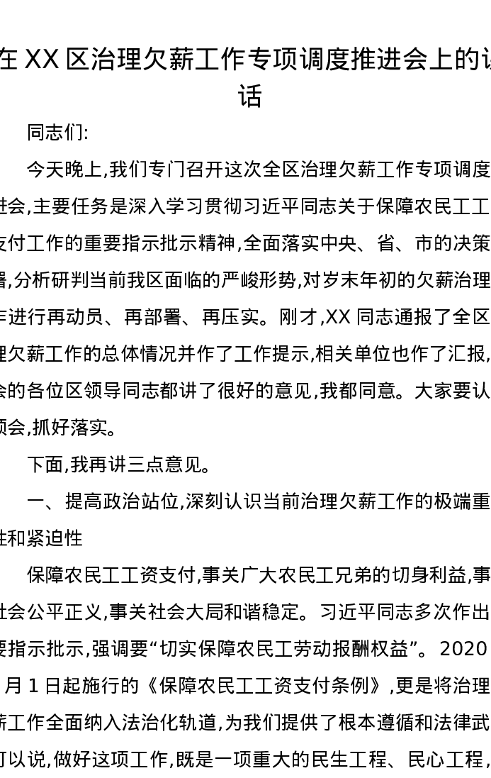 在XX区治理欠薪工作专项调度推进会上的讲话
