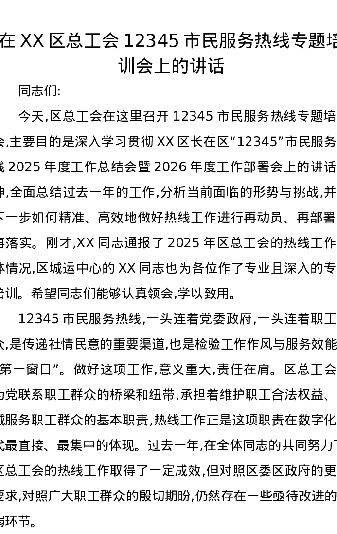 在XX区总工会12345市民服务热线专题培训会上的讲话