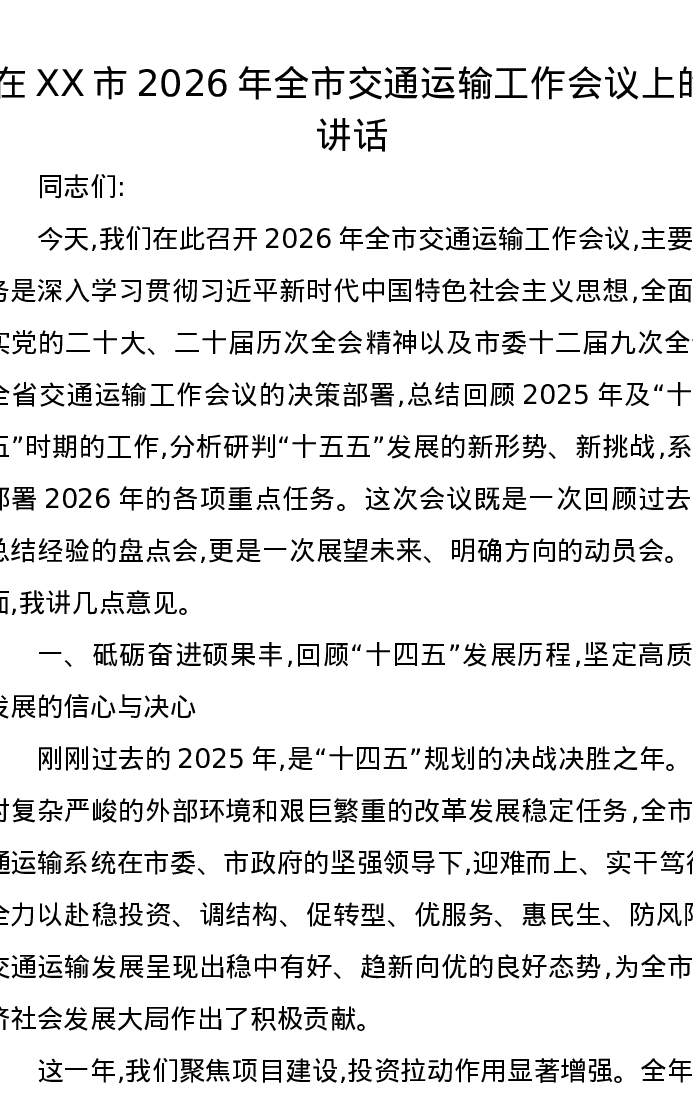 在XX市2026年全市交通运输工作会议上的讲话