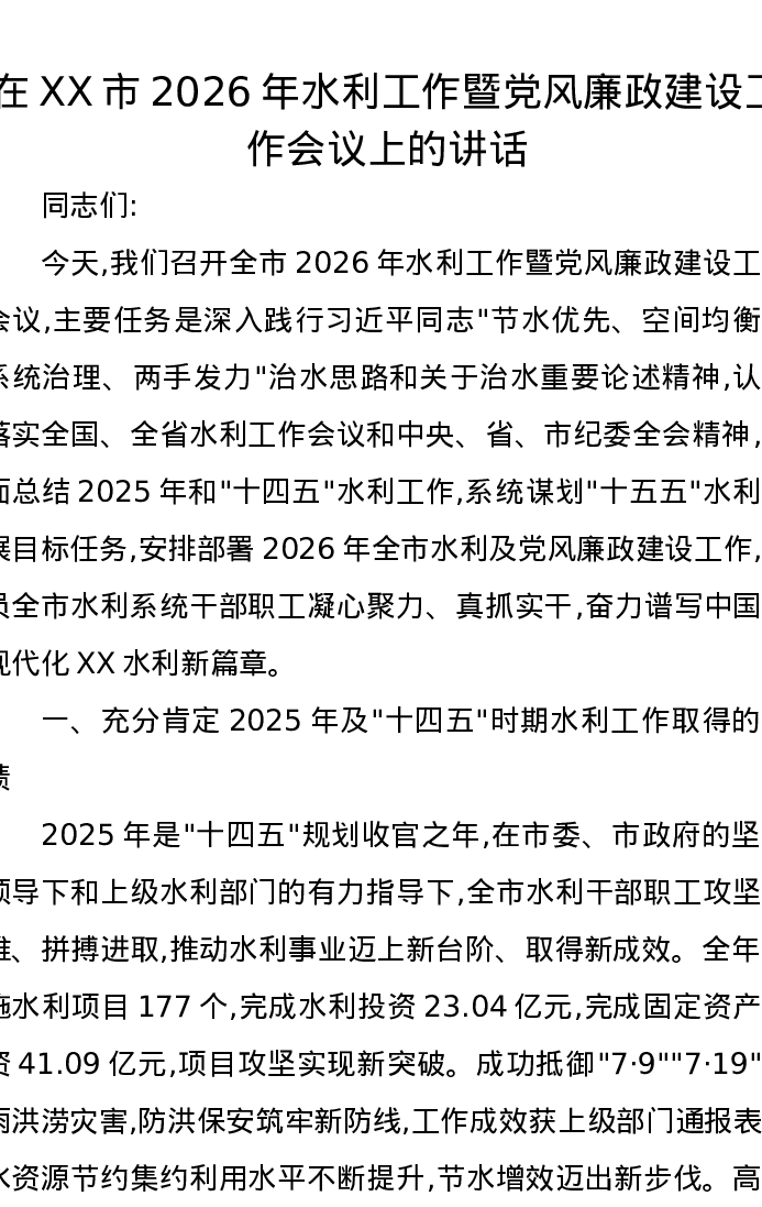在XX市2026年水利工作暨党风廉政建设工作会议上的讲话
