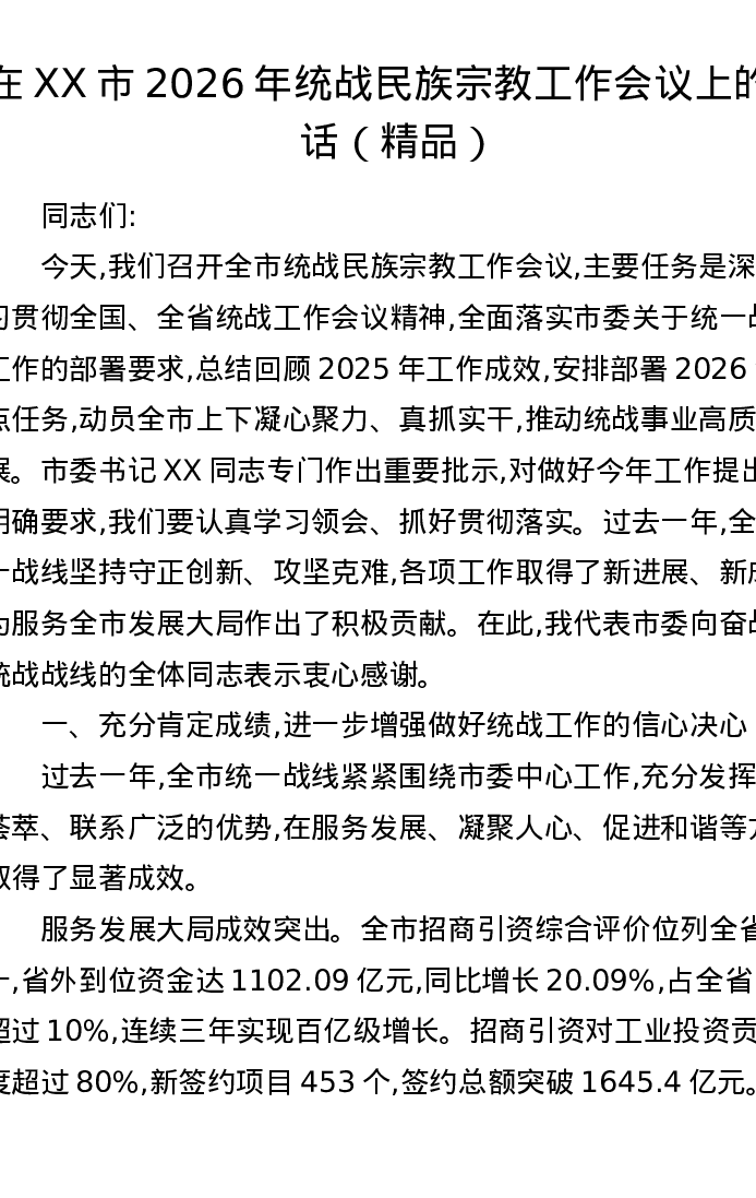 在XX市2026年统战民族宗教工作会议上的讲话