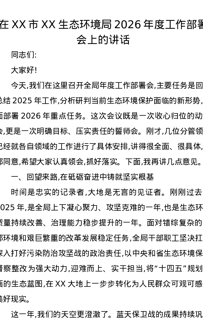在XX市XX生态环境局2026年度工作部署会上的讲话