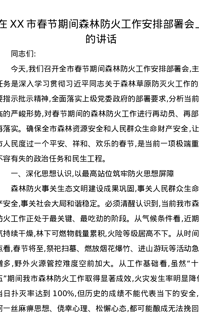 在XX市春节期间森林防火工作安排部署会上的讲话