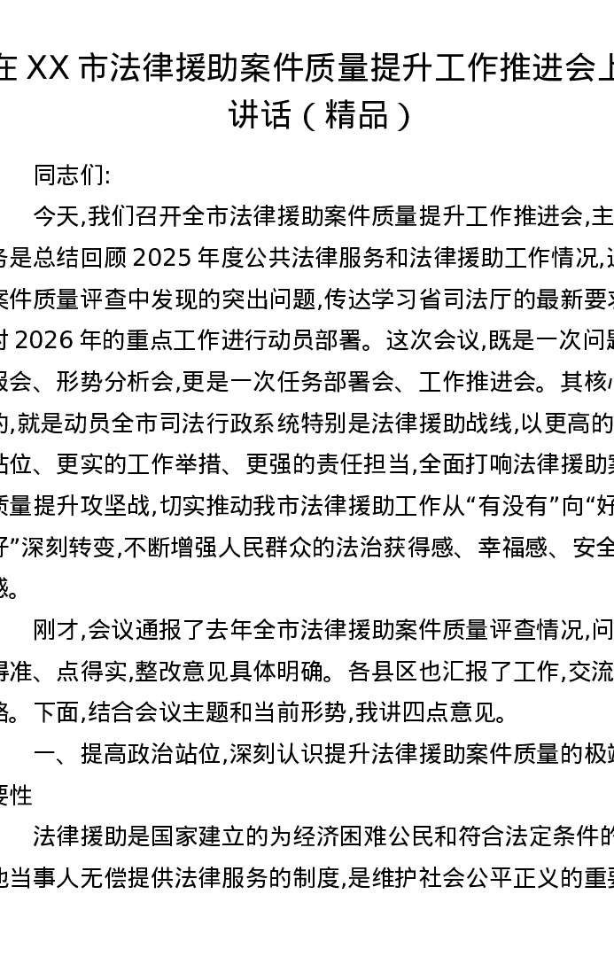 在XX市法律援助案件质量提升工作推进会上的讲话