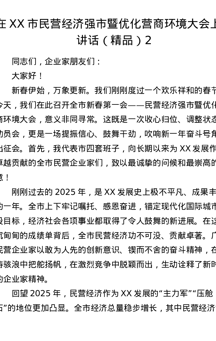 在XX市民营经济强市暨优化营商环境大会上的讲话2