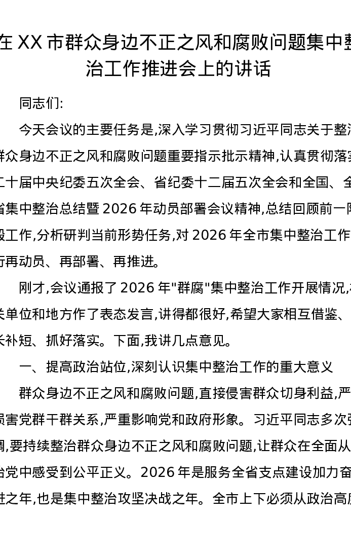 在XX市群众身边不正之风和腐败问题集中整治工作推进会上的讲话