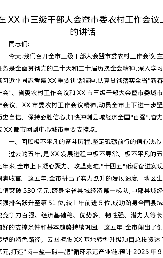 在XX市三级干部大会暨市委农村工作会议上的讲话