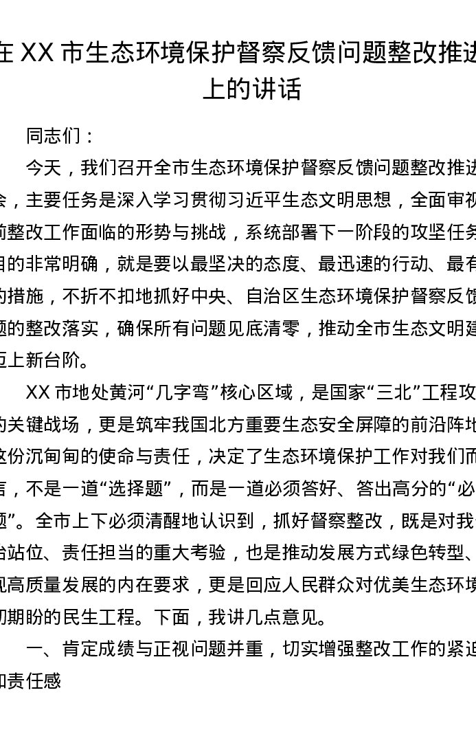 在XX市生态环境保护督察反馈问题整改推进会上的讲话