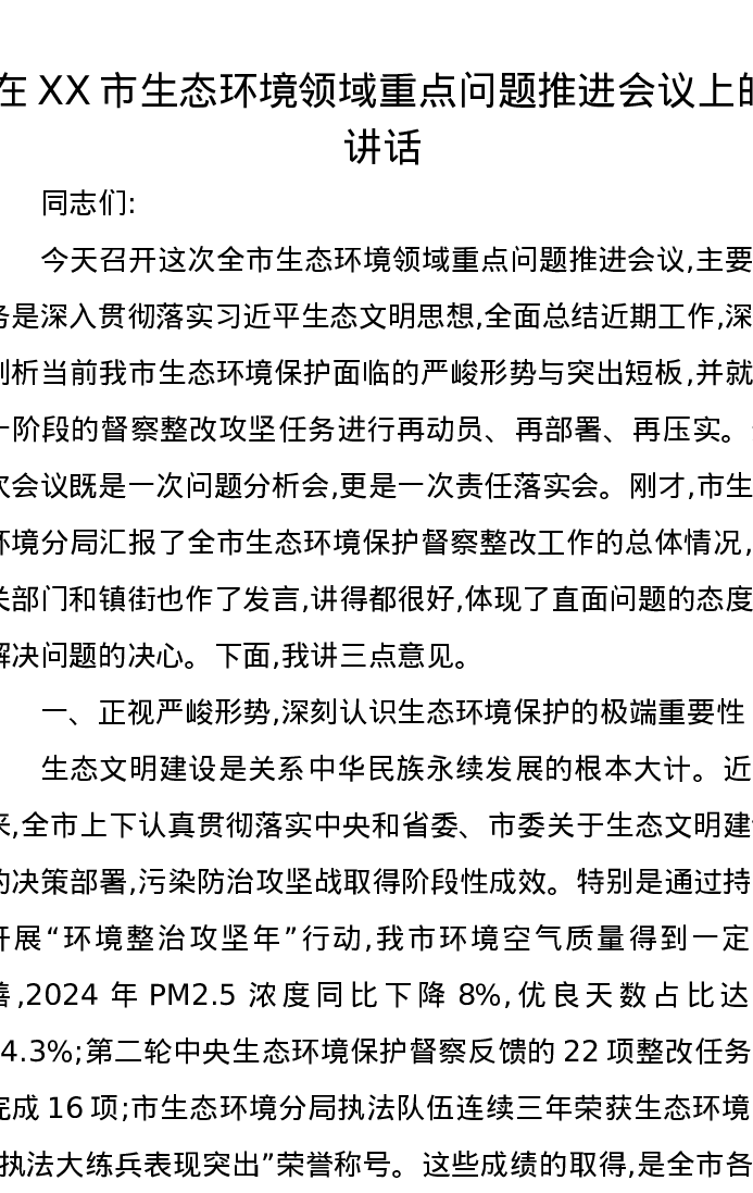 在XX市生态环境领域重点问题推进会议上的讲话