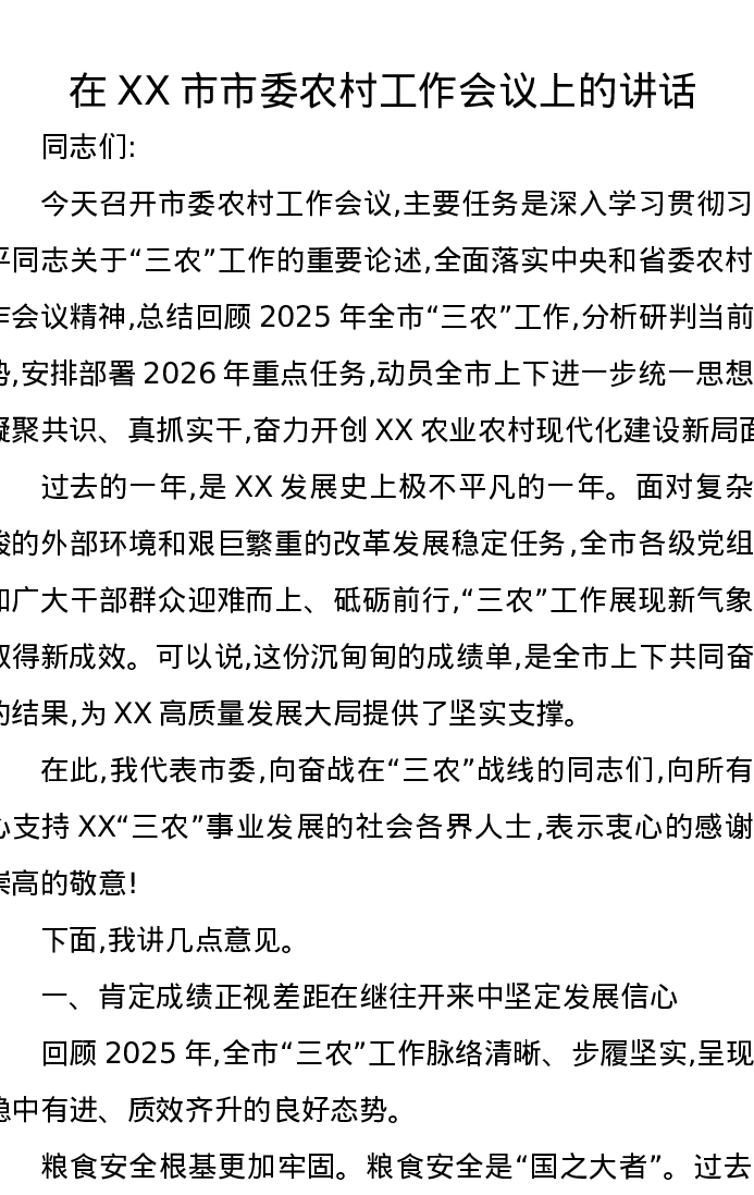 在XX市市委农村工作会议上的讲话