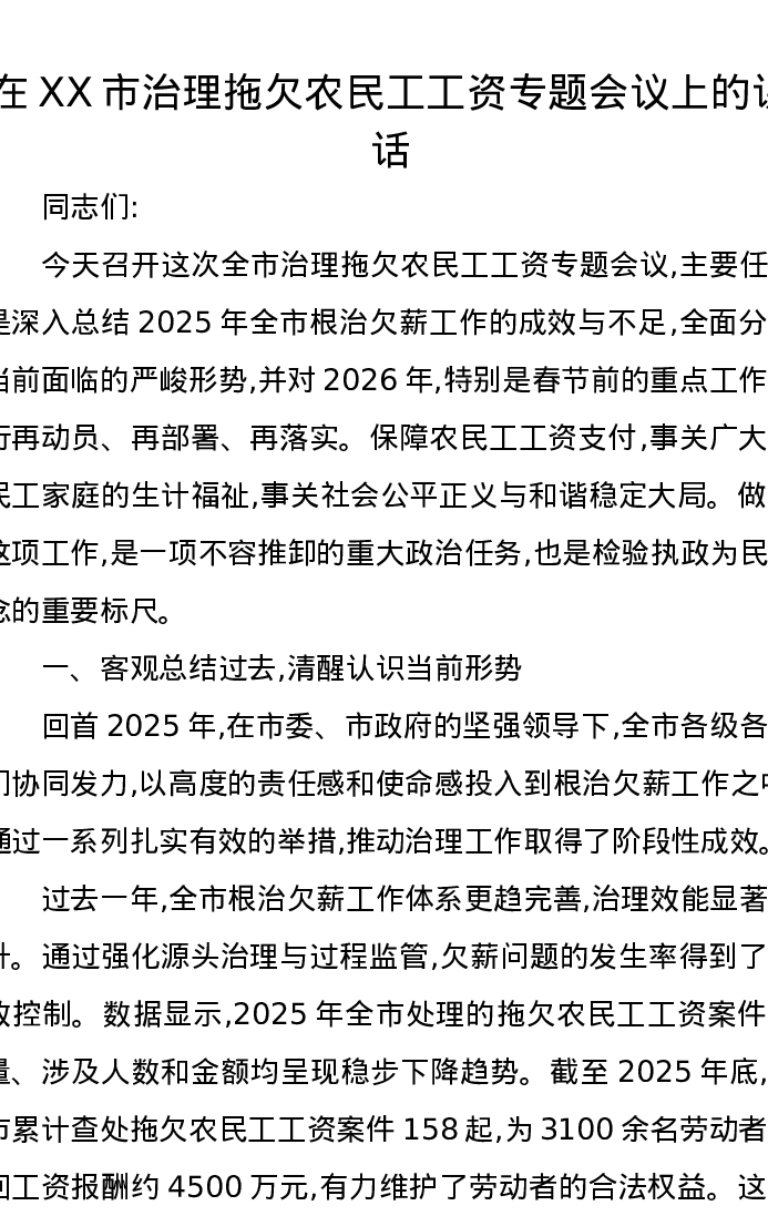 在XX市治理拖欠农民工工资专题会议上的讲话