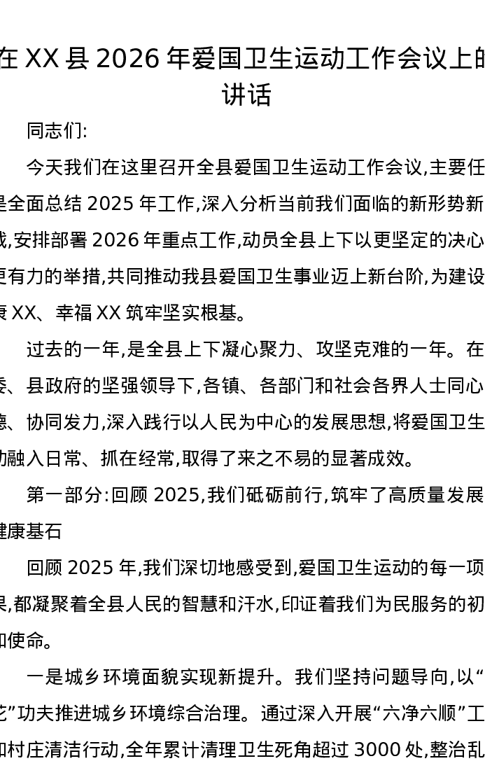 在XX县2026年爱国卫生运动工作会议上的讲话
