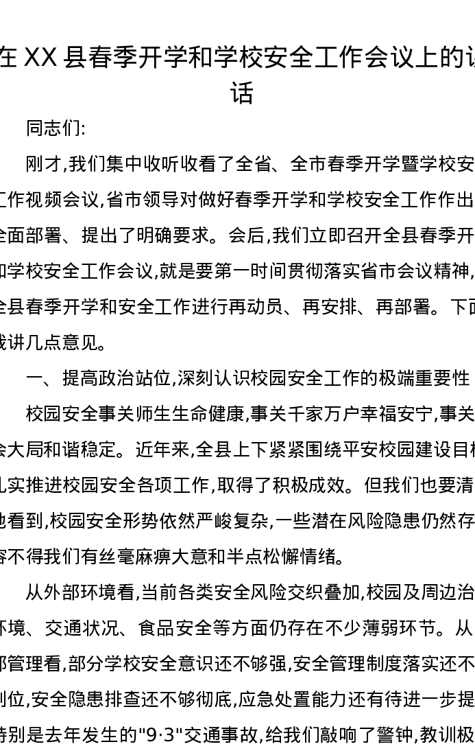 在XX县春季开学和学校安全工作会议上的讲话
