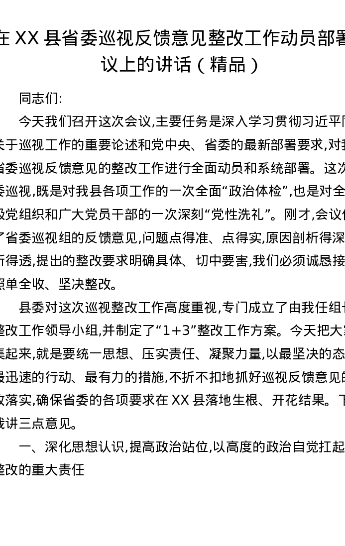 在XX县省委巡视反馈意见整改工作动员部署会议上的讲话